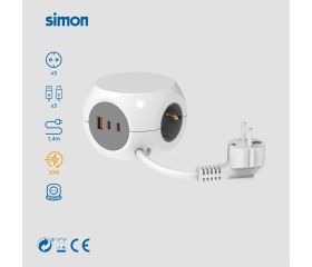 BASE MÚLTIPLE COMBI 4 TOMAS 16A 250V~ Y 2 PUERTOS USB 2,5A BLANCA CON 1,5 METROS DE CABLE H05VV-F 3G1,5MM² SIMON BRICO